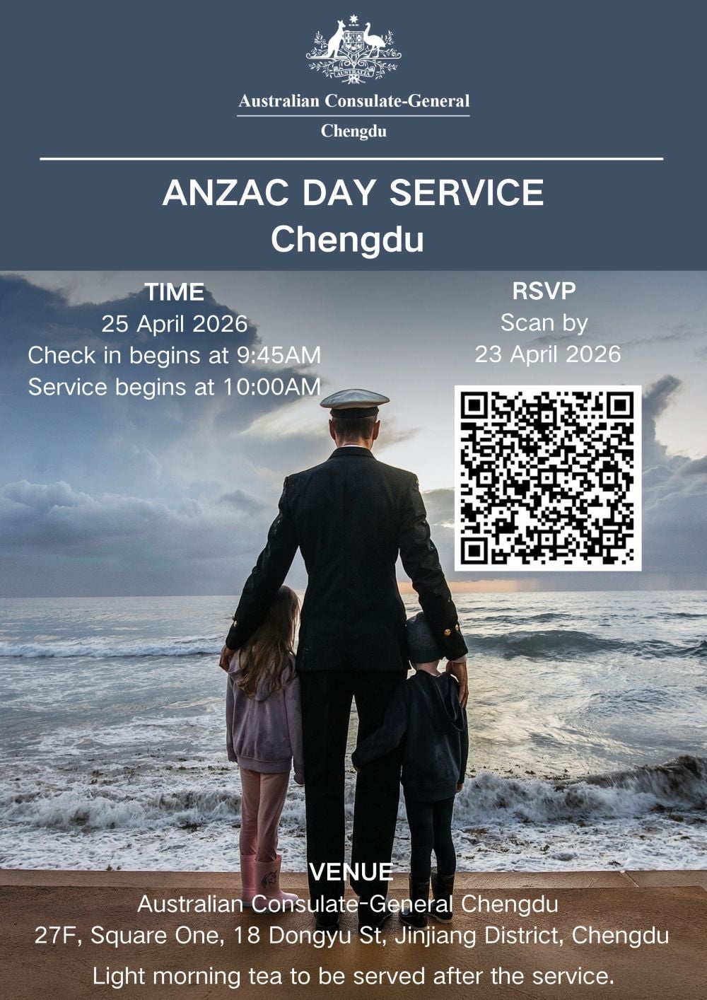 The Australian Consulate-General in Chengdu invites members of the Australian and New Zealand community in southwest China to attend the 2026 ANZAC Day Service in Chengdu on Saturday 25 April. Join us as we honour the courage and sacrifice of the Australians and New Zealanders who contributed to shaping the story of our nations.