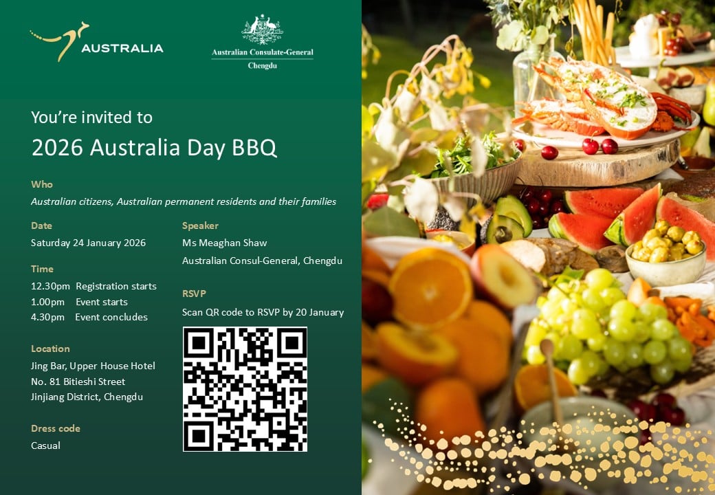 The Australian Consulate-General in Chengdu invites all Australian citizens, Australian permanent residents and their families in southwest China to an Australia Day BBQ at Upper House Chengdu on Saturday 24 January 2026.